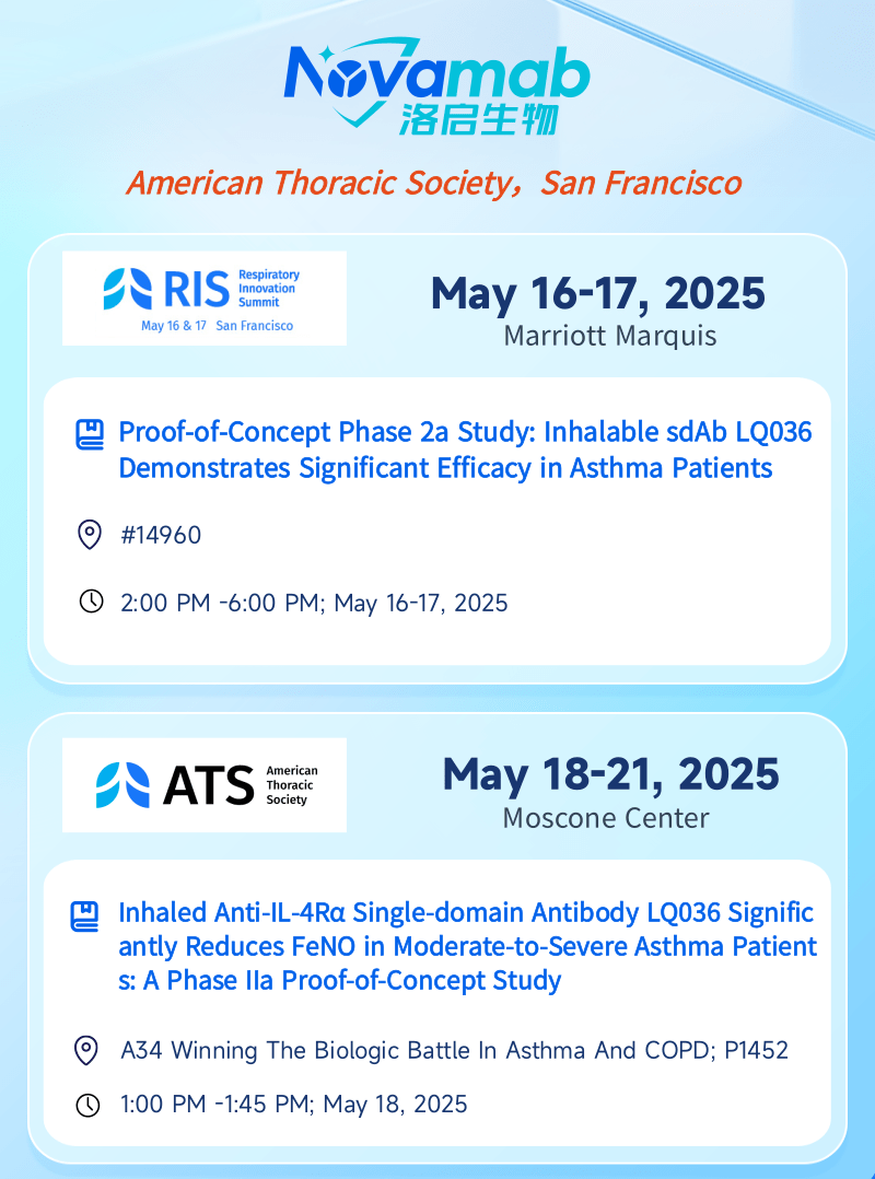 中国上海,2025年5月13日——上海PA视讯官网生物医药技术有限公司,一家专注于纳米抗体创新药研发的生物技术企业,今日宣布:PA视讯官网生物将于当地时间5月16日至21日赴美国加州旧金山,受邀参加美国胸科学会(American Thoracic Society, ATS)主办的呼吸创新峰会(Respiratory Innovation Summit,RIS)及ATS国际大会。届时PA视讯官网生物将分别在RIS和ATS两场大会上以壁报形式呈现最新临床数据——公司自主研发的靶向 IL-4Rα 吸入性生物制剂 LQ036 首个 IIa 期概念验证性临床试验数据。本次展示将全面披露 LQ036 在中重度哮喘患者中的安全性、耐受性、药效指标及初步疗效,标志着PA视讯官网生物在下一代呼吸道吸入式生物制剂开发领域迈出关键里程碑。